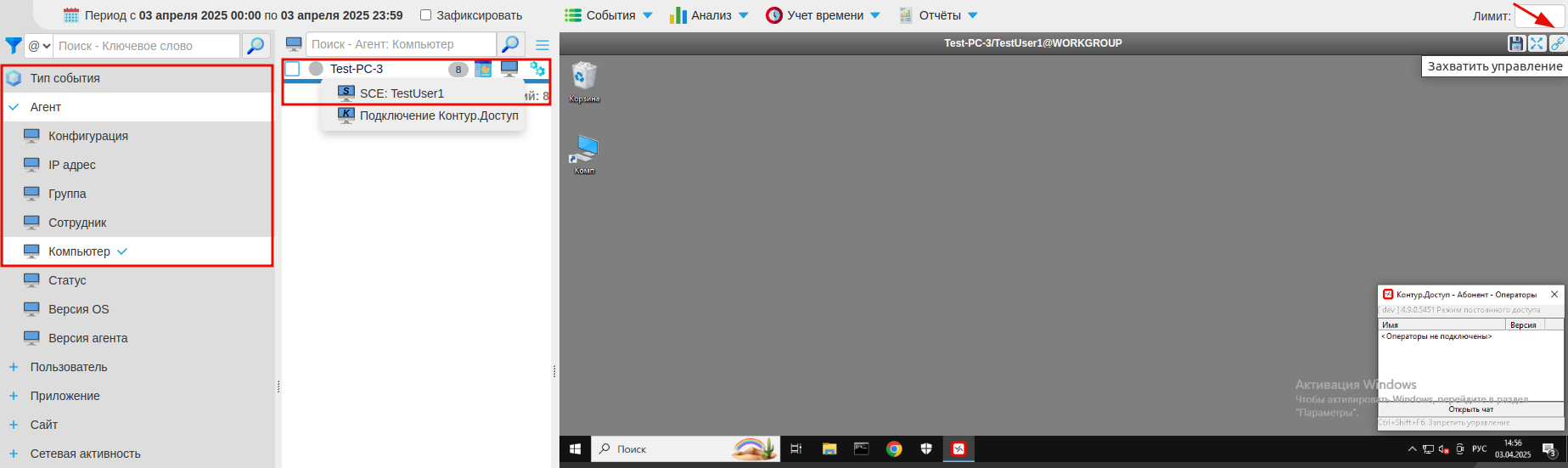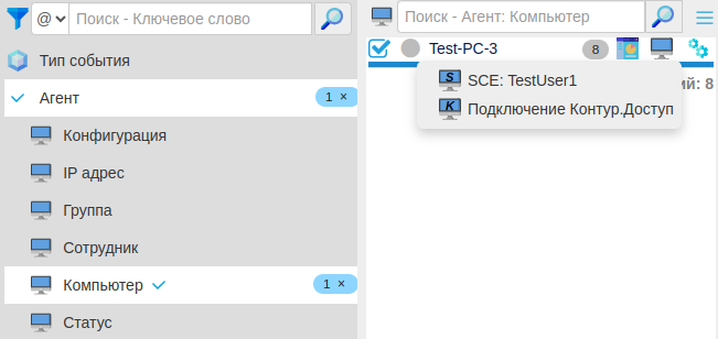 Нажмите на значок монитора рядом с именем агента. Отобразится меню с опциями SCE и Контур.Доступ.