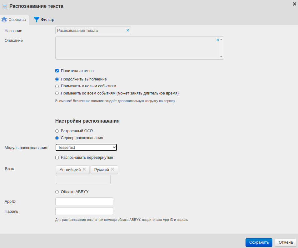 В папке Политики → Анализ контента откройте политику Распознавание текста.