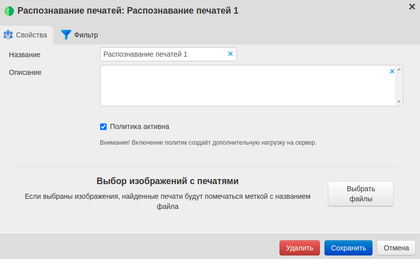 Нажмите кнопку + Создать → Распознавание печатей. Откроется окно создания политики.