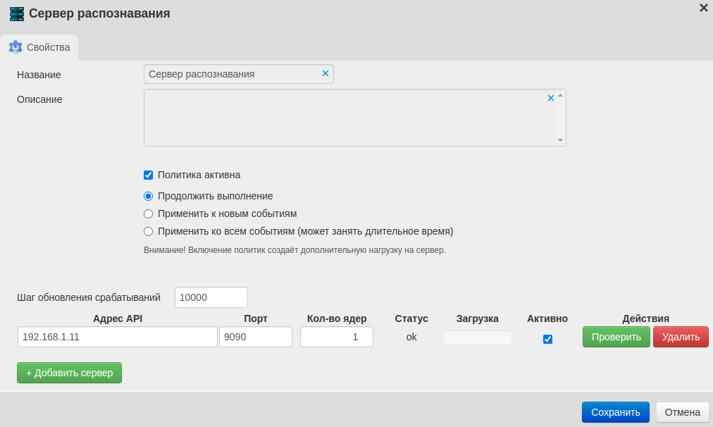 Порт — порт доступа к серверу распознавания. По умолчанию — 9090.