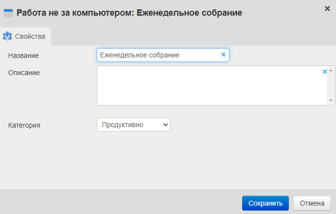 В модальном окне укажите категорию продуктивности Продуктивно и название, например Еженедельное собрание.