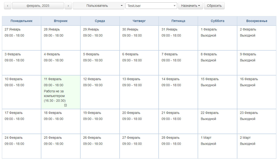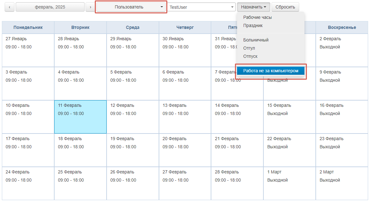Работа не за компьютером — это функция для учета работы не за компьютером. Например, у сотрудника TestUser есть регулярное очное собрание, которое должно учитываться как продуктивная деятельность.