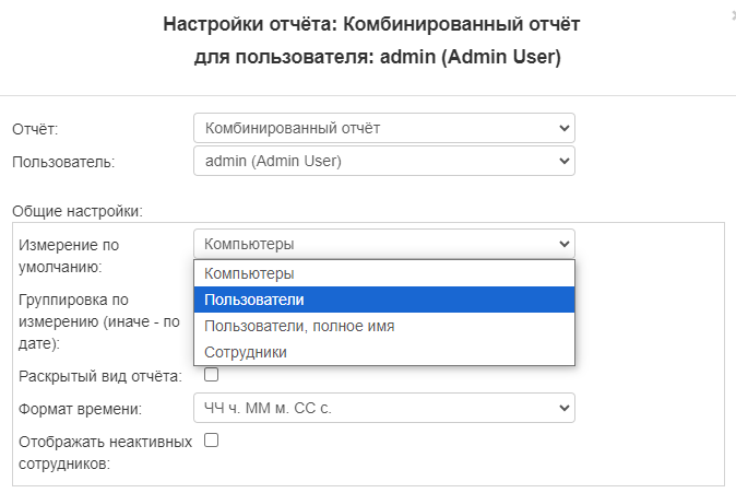 Выберите Учет времени → Комбинированный отчет и нажмите на шестеренку. Откроется окно Настройки отчета.