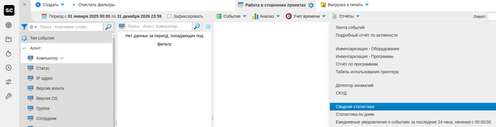 Перед работой с отчетами установите нужный период в датапикере.