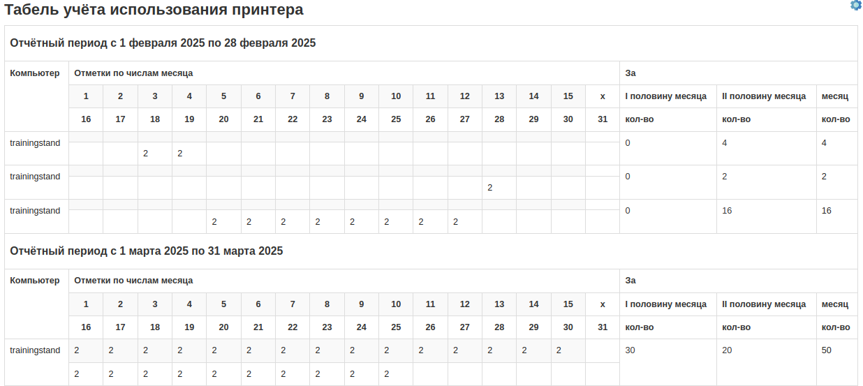 Табель использования принтера — для детального анализа с расределением печати по дням.