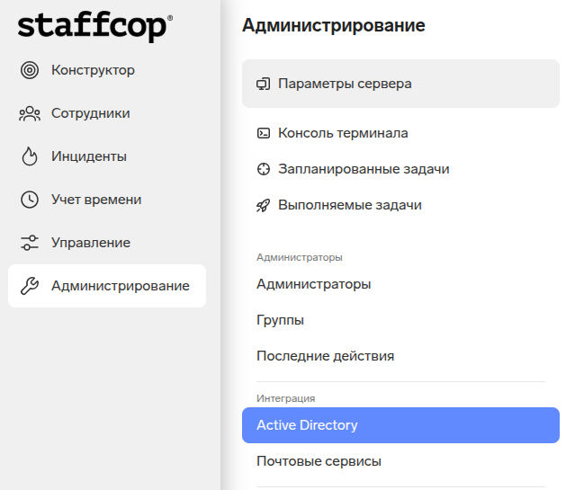 Staffcop Enterprise подключается к службе каталогов Microsoft Active Directory для синхронизации аккаунтов и конфигураций.