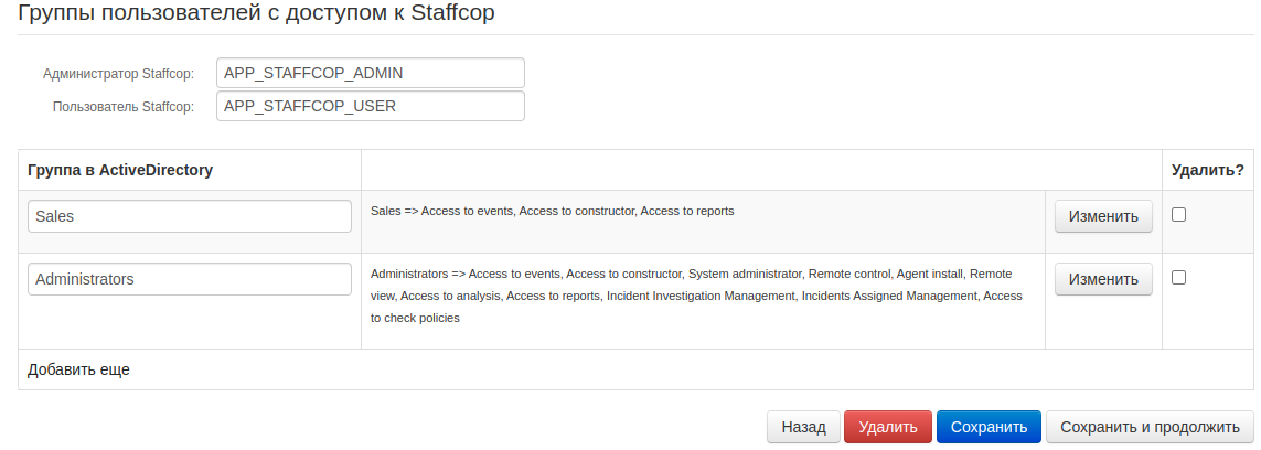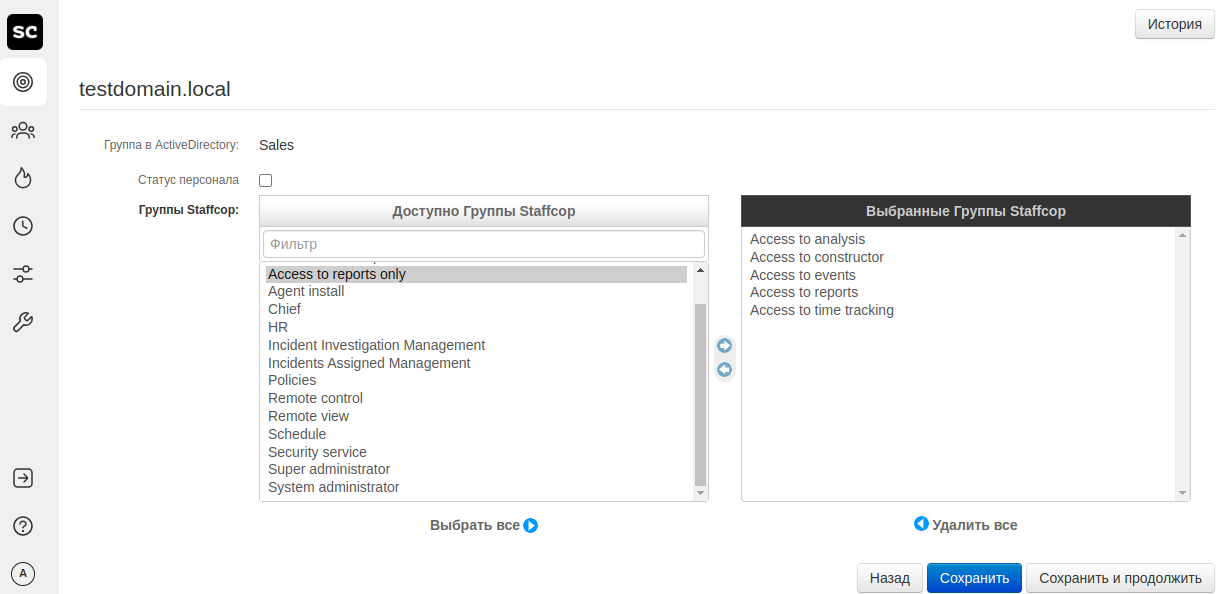 Группы из AD можно использовать для управления правами доступа пользователей в Staffcop. Например:
