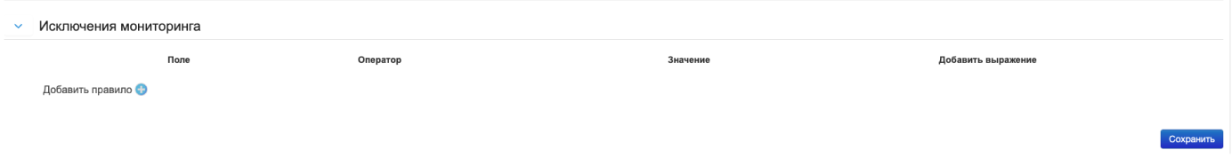 Исключение мониторинга — позволяет исключать из мониторинга определенные события. Правила исключения описаны в статье Исключения мониторинга.