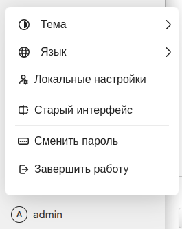 admin — настройки интерфейса, выбор базы данных, смена пароля и завершение работы.