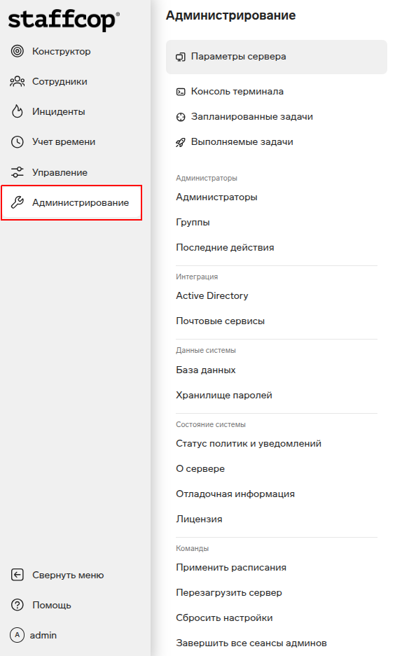 Администрирование — функции и настройки сервера.