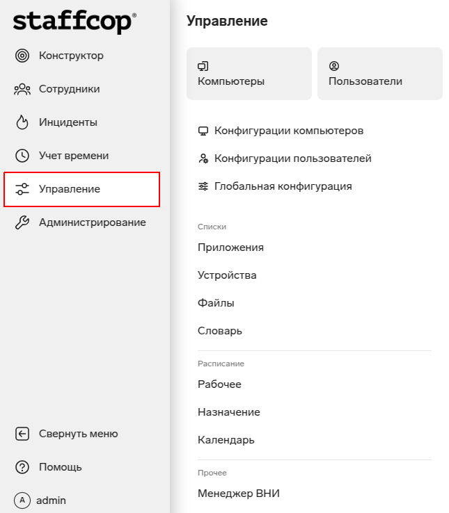 Начиная с версии Staffcop Enterprise 5.6.1, доступен новый интерфейс с упрощенной структурой элементов управления и отображения информации. В интерфейсе Админ, Панель управления, Отчеты и другие элементы управления располагаются в боковой панели.