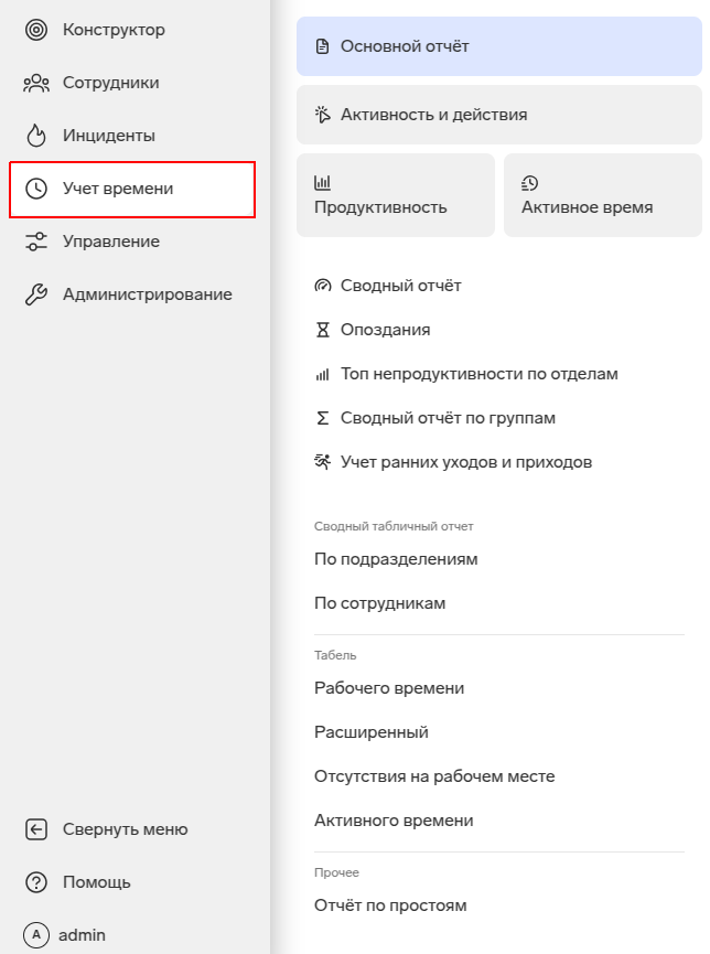 Учет времени — отчеты по рабочему времени сотрудников.