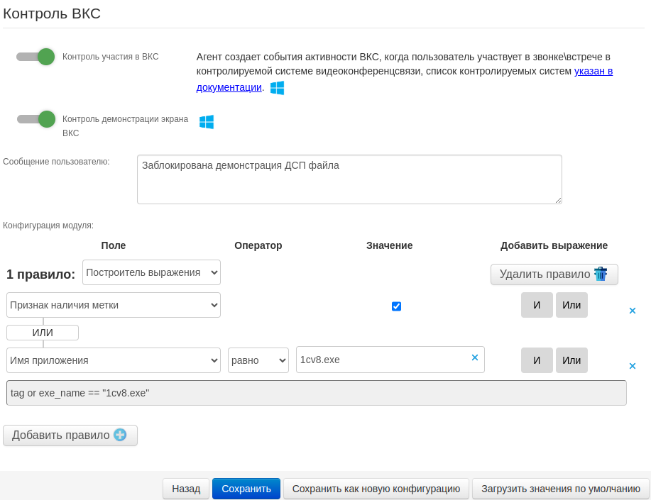 Контроль ВКС отслеживает время активности и демонстрацию экрана во время видеоконференции. При попытке показать запрещенный контент модуль прерывает демонстрацию и отправляет пользователю предупреждение.