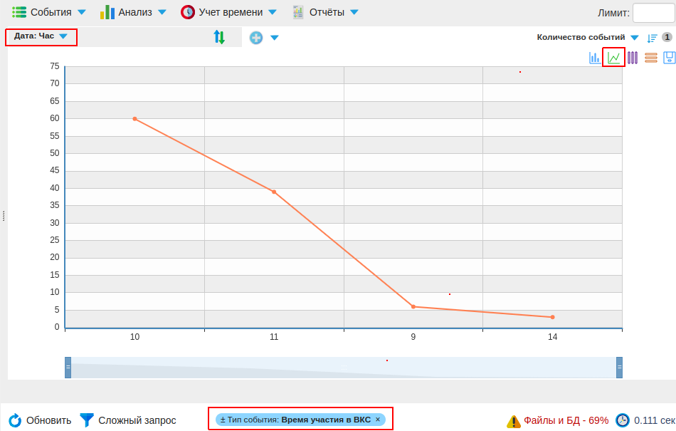 Результат: почасовой график, котоый отображает продолжительность участия пользователя в сеансах ВКС за выбранный период.